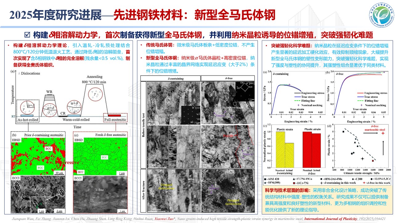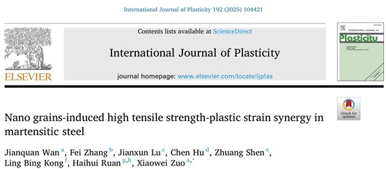 大湾区大学左小伟课题组联合中国科学院高能物理研究所、深圳技术大学、香港大学、东北大学及香港理工大学等合作单位,在高强马氏体钢塑韧化机制研究中取得重要进展。相关成果以“Nano grains-induced high tensile strength-plastic strain synergy in martensitic steel”为题,发表于国际塑性领域顶级期刊 International Journal of Plasticity。