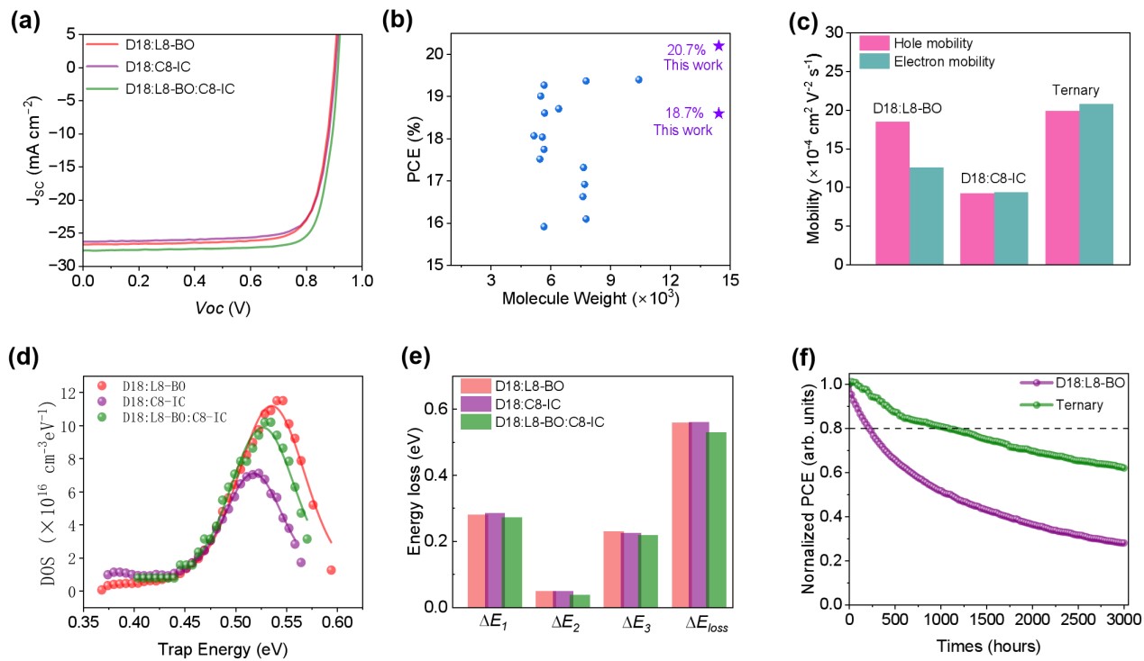最终,基于C8-IC的二元有机太阳电池器件实现了18.7%的能量转换效率。此外,C8-IC还可作为高效的结晶调节剂引入三元体系,作为辅助受体实现了高达20.7%的器件效率,跻身当前单结有机太阳能电池的最高效率行列。得益于其高分子量特性以及树枝状结构诱导的增强相互作用,显著提升了材料的玻璃化转变温度,有效抑制分子扩散,基于C8-IC的三元器件表现出卓越的稳定性。该研究成果不仅验证了树枝化策略在开发高效且低扩散系数受体材料方面的有效性,也为构筑兼具高性能与高稳定性的聚合物太阳能电池提供了具有前瞻性的材料设计思路。
