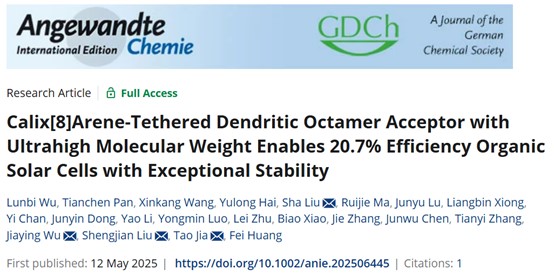 近日,大湾区大学物质科学学院刘莎研究员在兼具高效率与高稳定有机太阳能电池研究方向取得新进展。相关研究成果以“Calix[8]arene-Tethered Dendritic Octamer Acceptor with Ultrahigh Molecular Weight Enables 20.7% Efficiency Organic Solar Cells with Exceptional Stability” 发表在国际知名期刊Angewandte Chemie International Edition上。大湾区大学物质科学学院刘莎研究员、香港科技大学(广州)的吴佳莹教授、华南师范大学的刘升建研究员以及广东技术师范大学的贾涛副教授为论文共同通讯作者。大湾区大学访问学生吴伦比为论文第一作者。大湾区大学为论文通讯单位。