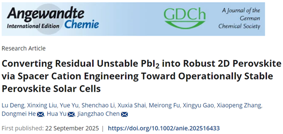 大湾区大学物质科学学院于华教授课题组与昆明理工大学陈江照教授合作,在基于铯/甲脒(CsFA)的钙钛矿太阳能电池方面取得新进展。相关成果以“Converting Residual Unstable PbI2 into Robust 2D Perovskite via Spacer Cation Engineering Toward Operationally Stable Perovskite Solar Cells”为题发表在《Angewandte Chemie International Edition》期刊。
