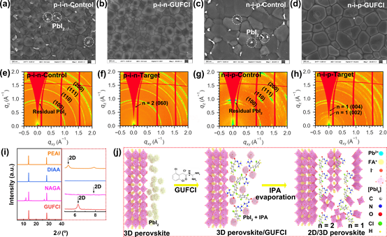 解决由残留的碘化铅(PbI2)所引起的光不稳定问题对于同时实现高功率转换效率和优异稳定性至关重要。在此,本研究报告了一种基于维度工程的有效管理残留光活性碘化铅PbI2的策略。胍法辛盐酸盐(GUFCl)作为添加剂或界面改性剂被用于调节钙钛矿薄膜,将晶界(GB)处的残留碘化铅PbI2转化为稳定的二维钙钛矿,这抑制了钙钛矿薄膜的光分解,抑制了离子迁移,从而稳定了晶界。