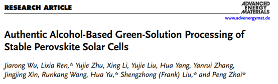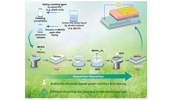 大湾区大学物质科学学院于华教授课题组与大连化物所刘生忠教授、陕西师范大学翟鹏副研究员合作,从循环经济和绿色化学的角度出发,首次开发了一种使用醋酸铅(Pb(Ac)₂)作为铅源、绿色醇类作为溶剂来制备钙钛矿的方法。相关成果以“Authentic Alcohol-Based Green-Solution Processing of Stable Perovskite Solar Cells”为题发表在《Adv. Energy Mater.》上。