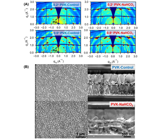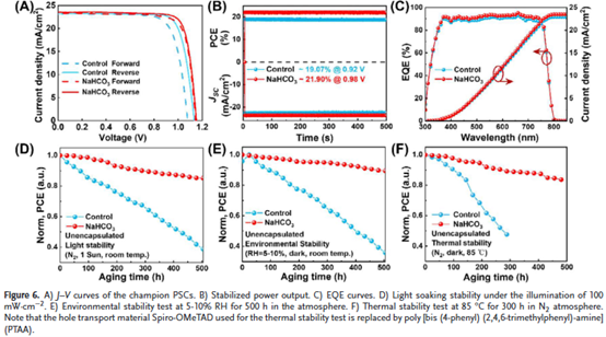 3. 巧妙的造孔策略与卓越性能:引入NaHCO₃作为造孔剂,其分解产生的CO₂气体形成多孔Pb(Ac)₂支架,极大促进了转化速率和完全性,最终器件效率高达22.03%,同时展现出优异的环境、热和光照稳定性(500小时后仍保持85%以上效率)。