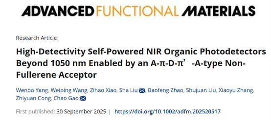 近日,大湾区大学物质科学学院刘莎研究员在高性能近红外有机光电探测器研究方向取得新进展。相关研究成果以“High-Detectivity Self-Powered NIR Organic Photodetectors Beyond 1050 nm Enabled by an A-π-D-π’-A-type Non-Fullerene Acceptor” 发表在国际知名期刊Advanced Functional Materials上。