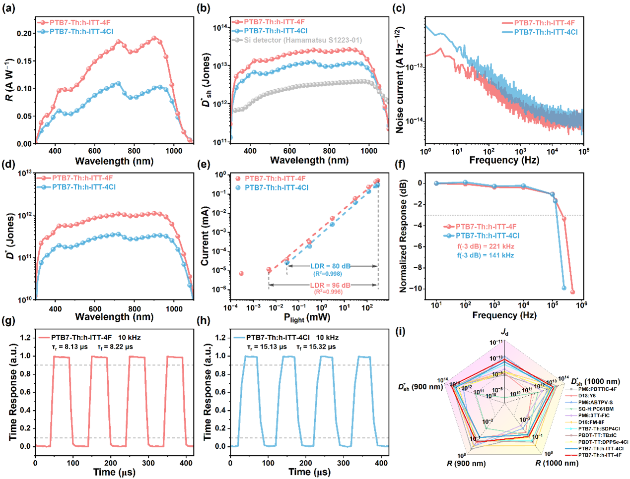 本研究通过调控共轭骨架的扭曲度,成功设计并合成了两种新型非富勒烯受体(NFA):h-ITT-4F 和 h-ITT-4Cl。与聚合物给体PTB7-Th共混后,该材料显著抑制了非辐射能量损失,提升了电荷传输效率并降低了陷阱密度。最终,该器件实现了低至1.65×10-10 A/cm2的暗电流密度,响应波长延伸至1050 nm以上,并且在400-1000 nm波段内的探测率(D*)均超过了1013 Jones,为高性能近红外有机光电探测器的开发提供了新思路。