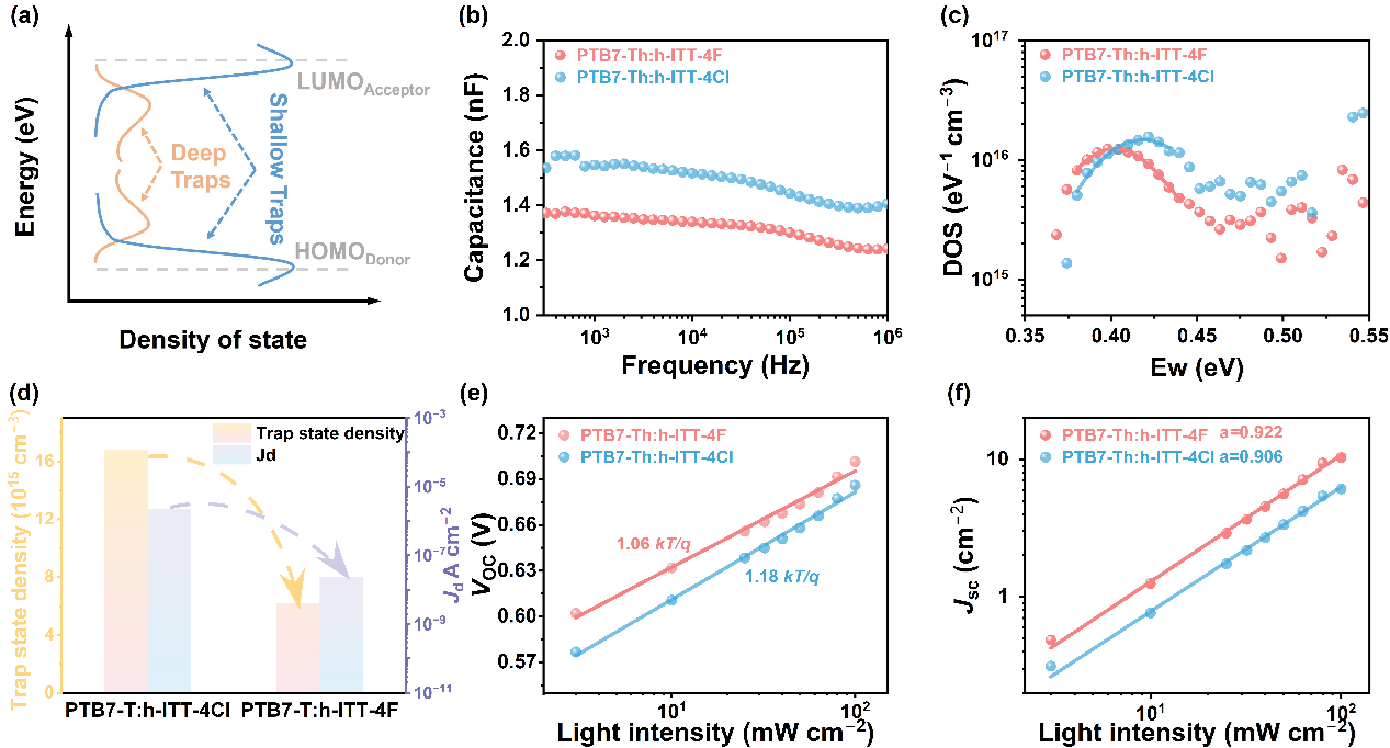 图1 陷阱态能级示意图、电容- 频率(C-ω)曲线与陷阱态密度(tDOS)分析(h-ITT-4F体系陷阱密度仅6.19×1014 cm⁻3,远低于h-ITT-4Cl的1.68×1015 cm⁻3),结合Voc-光强、Jsc-光强关系,验证陷阱辅助复合被显著抑制