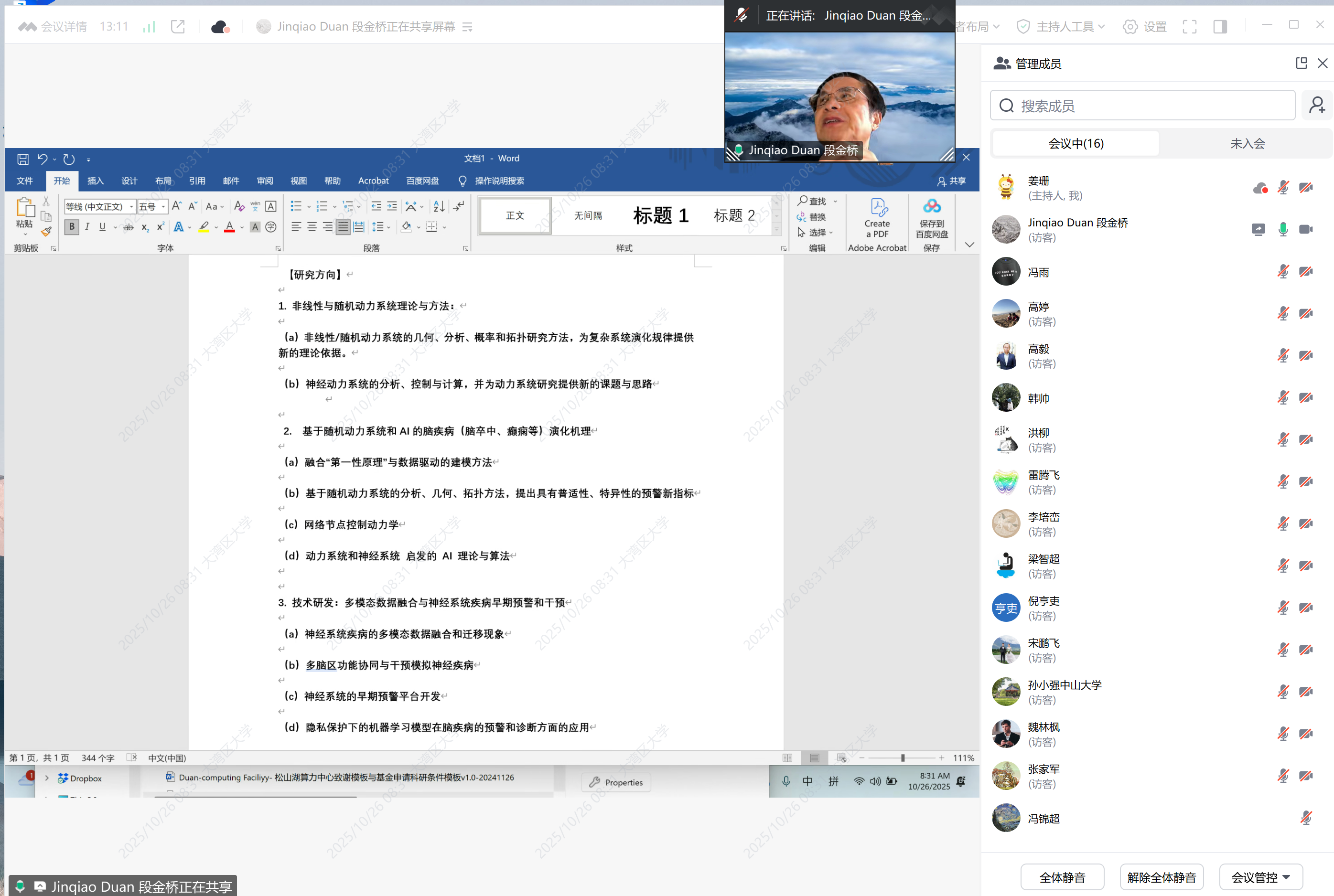 为系统梳理实验室在动力系统与神经系统交叉领域的季度研究成果,推动学术交流与科研合作,2025年10月26日(周日)08:30-11:45,广东省动力系统与神经系统交叉研究重点实验室以线上腾讯会议形式(会议ID:760-601-639)召开2025年第三季度进展汇报会。实验室科研人员、相关领域学者及研究生代表齐聚云端,围绕多维度研究课题展开深入分享与探讨。