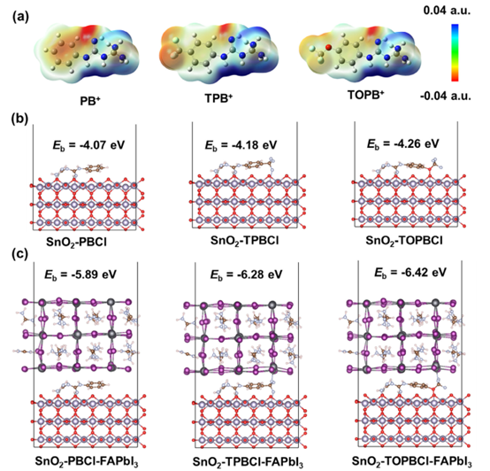 1. 开发新型多功能分子并构建分子设计数据库:基于TOPBCl的成功经验,未来可以系统探索具有不同官能团(如-CF₃、-COOH、-SO₃H等)和不同阳离子核心(如胍、脒等)的分子库,深入研究其与不同金属氧化物(如TiO₂、ZnO等)和钙钛矿组分的相互作用规律,建立“分子结构-界面特性-器件性能”的定量构效关系,为精准设计界面材料提供理论指导。