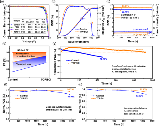 电子传输层和埋底界面较差的稳定性阻碍了稳定的、空气加工的正式钙钛矿电池的制备。鉴于此,在氧化锡纳米粒中引入1-[4-(三氟甲氧基)苯基]双胍盐酸盐(TOPBCl),实现了电子传输层及埋底界面的同时调控。通过三氟甲氧基和双胍阳离子的协同效应,实现了电子传输层和钙钛矿层之间的化学桥接,降低了界面缺陷、促进了钙钛矿结晶及优化了能级对齐。由于显著抑制的非辐射复合,TOPBCl修饰的电池取得了25.79%的光电转换效率,这是空气制备钙钛矿电池报道的最高效率之一。得益于电子传输层和埋底界面增强的稳定性,未封装的TOPBCl修饰的电池实现了优异的运行稳定性,在最大功率点持续工作927小时后保留90.04%的初始效率。