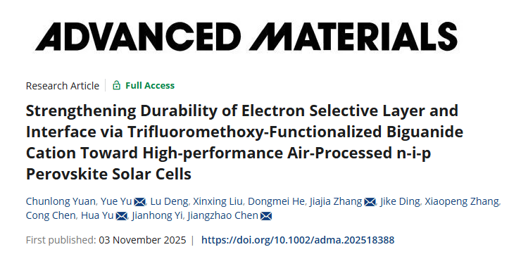 大湾区大学物质科学学院于华教授课题组与昆明理工大学陈江照教授合作,基于新型分子界面工程,在正式铯/甲脒/甲胺(0CsFAMA)钙钛矿太阳能电池方面取得新进展。相关成果以“Strengthening Durability of Electron Selective Layer and Interface via Trifluoromethoxy-Functionalized Biguanide Cation Toward High-performance Air-Processed n-i-p Perovskite Solar Cells”为题发表在《Advanced Materials》上。