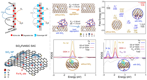 本研究以咖啡渣和工业废酸为原料,通过一步热解法制备了SiO2纳米颗粒(NPs)修饰的Fe-N-Si-C单原子催化剂。实验表明,SiO2 NPs均匀分布于碳骨架中,与Fe-N4位点形成Fe-O-Si界面结构。该结构不仅有效抑制H2O2的生成,还显著提升催化剂的稳定性与长期耐久性:在碱性介质中经过30,000次循环后,半波电位仅衰减5 mV,远优于未修饰样品及商用Pt/C。结合实验表征,夏广杰课题组的理论计算进一步揭示了SiO2 NPs的作用机制:Fe-O-Si键增强了OOH*中间体在Fe-N4位点上的吸附,促进四电子路径的ORR过程,同时抑制了H2O2和自由基的生成。此外,密度泛函理论计算表明SiO2 NPs还能阻止Fe单原子的团聚,稳定活性位点结构,从而显著延长催化剂寿命。这些实验与理论结果共同指向SiO2在稳定Fe–N4活性位点与调控反应路径方面的双重功能。