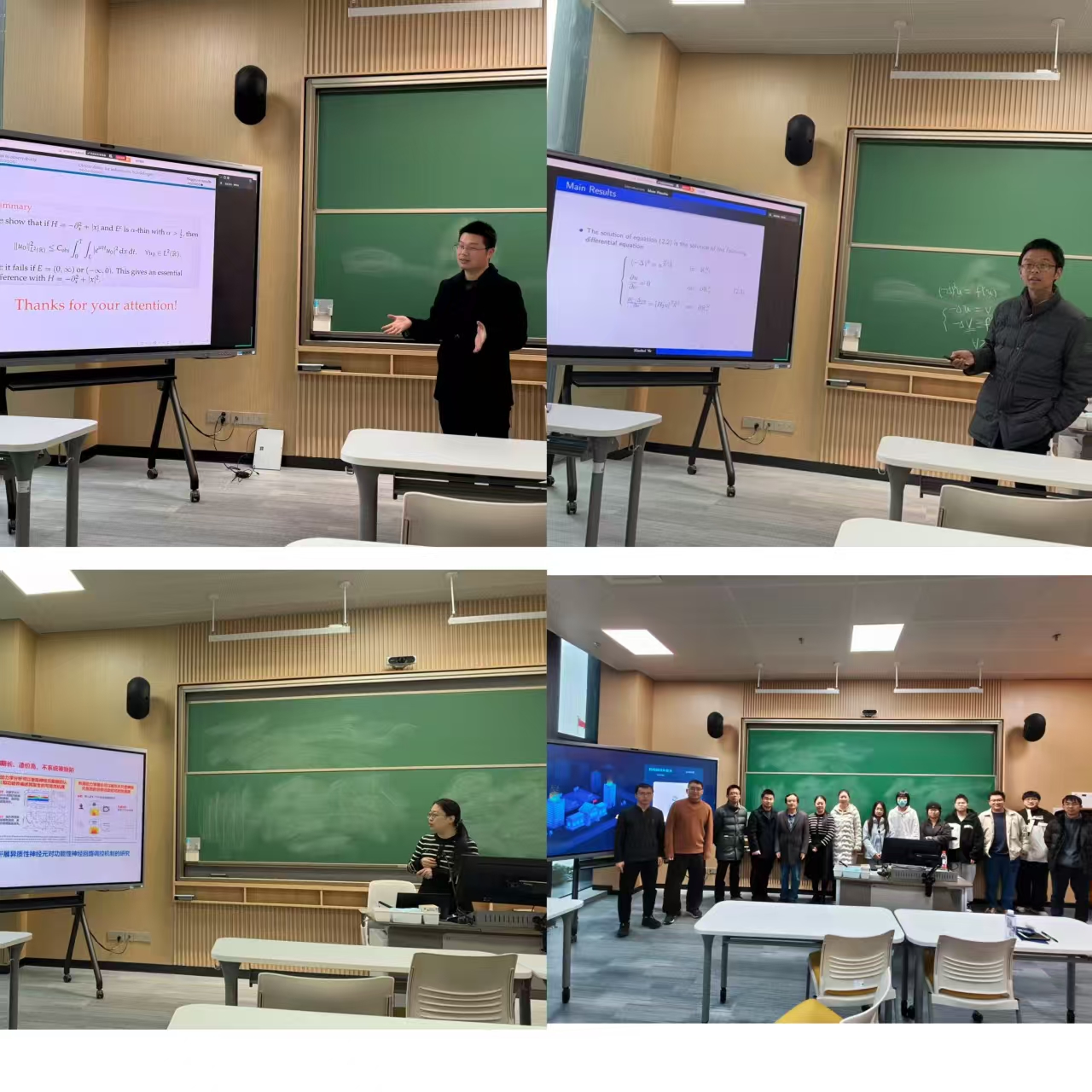 三位专家的报告内容兼具理论深度与应用价值,与省重实验室在“偏微分方程与应用数学”“计算神经科学”等方向的研究布局高度契合。互动环节中,实验室师生就谱不等式应用、积分方程求解技巧、神经模型构建等问题与专家展开深入探讨,现场学术氛围浓厚。