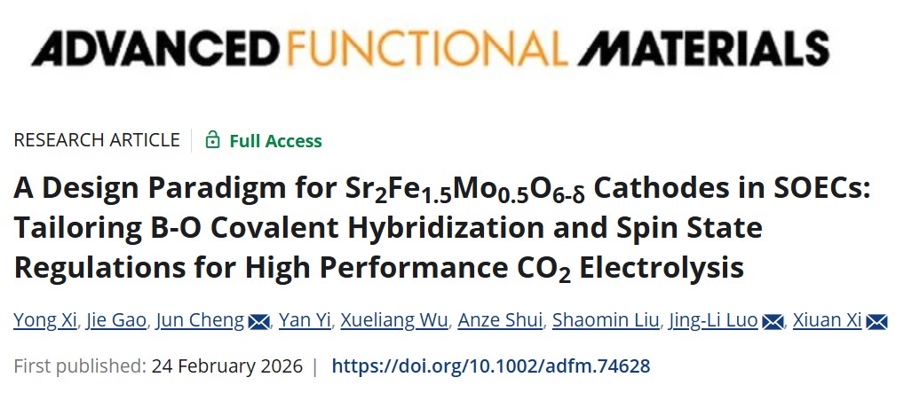 近日,大湾区大学物质科学学院奚修安课题组与深圳大学骆静利教授合作,在固体氧化物电解电池(SOEC)钙钛矿阴极材料方面取得新进展。研究团队提出了一种通过B位Ga掺杂调控Sr2Fe1.5Mo0.5O6-δ (SFM) 材料B-O共价杂化和自旋态的设计策略,有效抑制了Sr偏析并显著提升了CO2电解性能。相关研究成果以“A Design Paradigm for Sr2Fe1.5Mo0.5O6-δ Cathodes in SOECs: Tailoring B-O Covalent Hybridization and Spin State Regulations for High Performance CO2 Electrolysis”为题发表在国际权威期刊Advanced Functional Materials上。