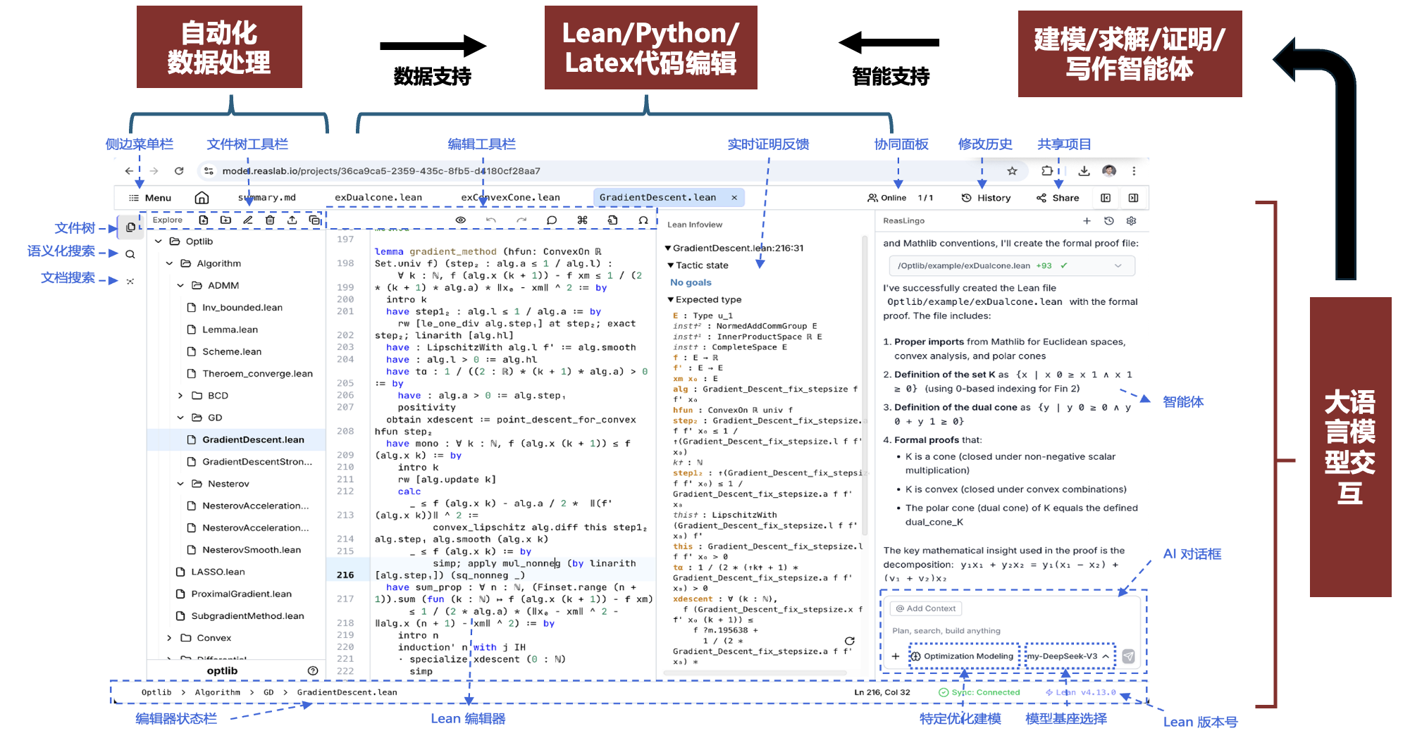 ReasLab 是面向教育、科研与复杂决策场景的一站式智能数学推理引擎,致力于让数学和应用触手可及,突破手工作业传统模式,构建从专家直觉驱动走向大众化、可计算、可验证的智能化基础设施。针对数学建模、算法设计与定理证明等关键环节长期相互割裂、深度依赖人工经验的问题,ReasLab 以大语言模型为基座,采用多智能体架构,融合数学模型库、算法库与定理知识库,将模型构建、算法设计、计算求解、自然语言和形式化证明及Markdown/LaTeX 报告生成等能力纳入统一环境,实现数学对象在不同表示层次与任务环节之间的贯通协同。依托云计算,用户无需安装即可在线使用。ReasLab 已为近千位用户提供形式化、优化建模、数学建模竞赛和科学写作等支持,为北京大学、新加坡国立大学等数十所高校提供形式化教学与科研工作空间,正服务华为、歌尔等企业实际需求,智能体 M2F 已形式化陶哲轩Analysis II、Rockafellar 的 Convex Analysis 等书籍,累计生成 Lean 代码30余万行,为数学研究与复杂决策提供可持续演进的基础支撑。ReasLab的研发得到了国家重点研发计划“大模型辅助运筹优化决策建模与计算”和国家重点研发计划“面向智能制造的约束规划算法与软件”资助与支持。