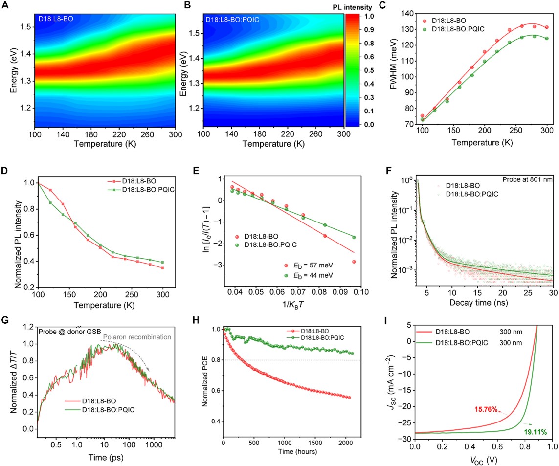 结果显示,PQIC 虽然单独作为光吸收材料效率有限,但作为三元体系的第三组分掺入 D18:L8-BO 活性层后,可显著提升光电性能。在优化条件下,器件在 100 nm 活性层厚度下达到 PCE 20.81%(第三方认证 20.60%),而在厚膜 300 nm 条件下仍保持 19.11%,远高于二元对照体系的 15.76%。该工作不仅验证了融合受体刚性聚合物作为三元体系添加剂的有效性,还揭示了分子骨架设计、电子-声子耦合抑制与分子有序排列的协同机制。这些成果为厚膜、高稳定性、可扩展 OSCs 的材料设计提供了全新的理论基础和分子工具,有望推动有机太阳能电池向高效率、厚膜兼容及产业化应用迈进。