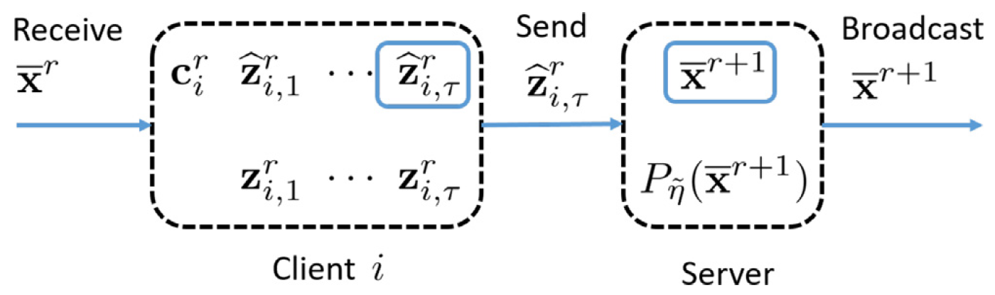 ▸ 解耦邻近算子与通信: 每个节点维护操作前后两个变量,将邻近算子计算与通信步骤彻底解耦。节点仅需将未经邻近操作的中间变量上传至服务器,服务器即可提取各节点的平均梯度信息,从而正确驱动全局模型更新。